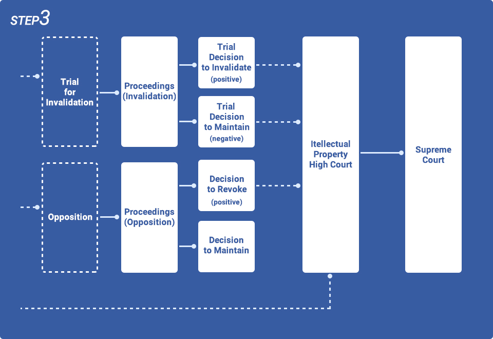 The invalidation trial proceedings begin with the request for invalidation trial by the demandant (person with interest, no anonymous filing) and the filing of the grounds for invalidation. The court (or board of appeal examiners in case of the JPO) appoints a panel which provides copies of the demandant’s filing documents and an invitation to response to thereto to the patent proprietor (or his local representative). The patent proprietor may file a preparatory document including a written argument and request for correction.
